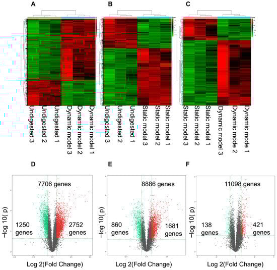 Differentially expressed genes in Caco-2 cells stimulated with digestion products. (A–C) Heatmaps showing clustering of gene expression profiles across treatments, confirming high reproducibility and clear segregation of replicates. (D) Comparison of dynamic model vs. control group. (E) Comparison of static model vs. control group. (F) Direct comparison of dynamic vs. static digestion products. Up-regulated genes are shown in red and down-regulated genes in green. The gens falling between the two thresholds are indicated in gray.