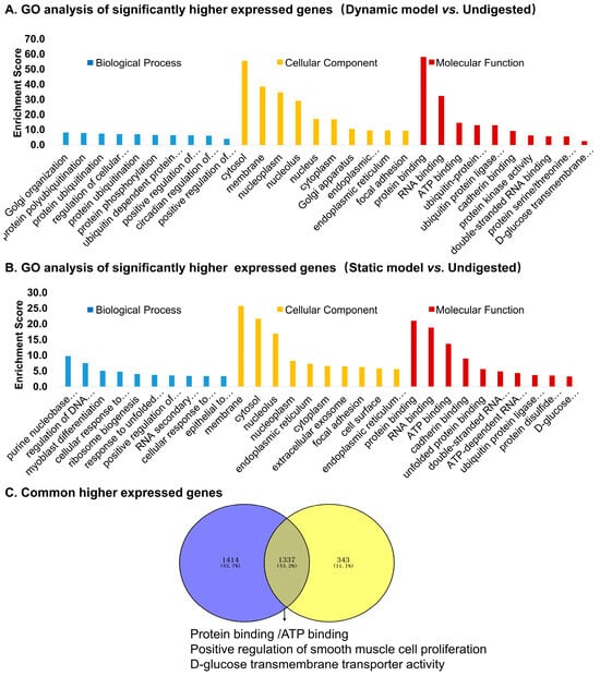 Gene Ontology (GO) enrichment analysis of significantly upregulated genes in Caco-2 cells stimulated by digestion products. (A) Top enriched GO terms for genes upregulated in the dynamic model vs. undigested control. (B) Top enriched GO terms for genes upregulated in the static model vs. undigested control. (C) Venn diagram showing commonly upregulated genes shared between dynamic and static models, with functional enrichment highlighting protein binding, ATP binding, glucose transporter activity, and smooth muscle cell proliferation.