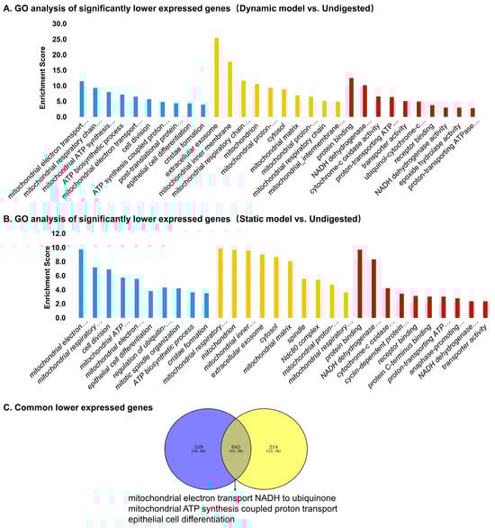 Gene Ontology (GO) enrichment analysis of significantly downregulated genes in Caco-2 cells stimulated by digestion products. (A) Top enriched GO terms for genes downregulated in the dynamic model vs. undigested control. (B) Top enriched GO terms for genes downregulated in the static model vs. undigested control. (C) Venn diagram showing commonly downregulated genes shared between dynamic and static models, with enrichment highlighting mitochondrial electron transport, ATP synthesis, and epithelial cell differentiation.