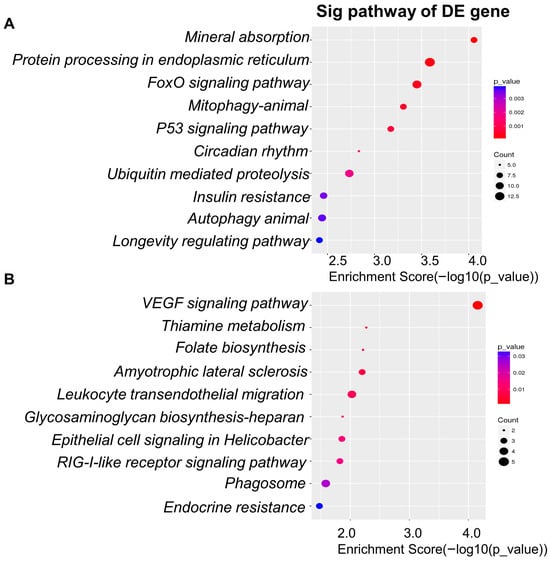 KEGG pathway enrichment of differentially expressed genes in Caco-2 cells exposed to digestion products. (A) Top 10 pathways with higher expression in the dynamic model vs. static model. (B) Top 10 pathways with lower expression in the dynamic model vs. static model.