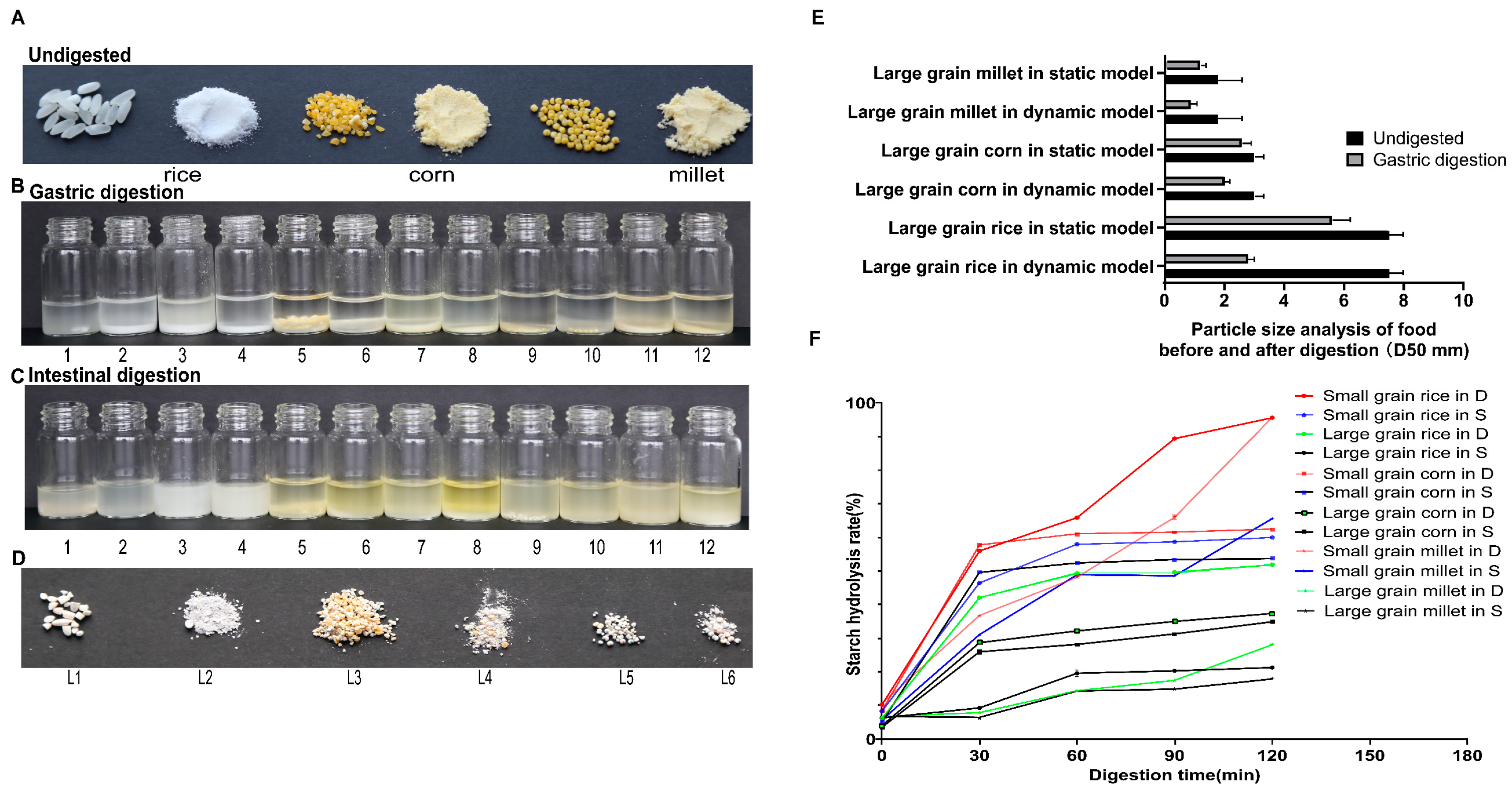 3.1. Comparison of Digestion Outcomes for 3 Cereals in Static and Dynamic Models