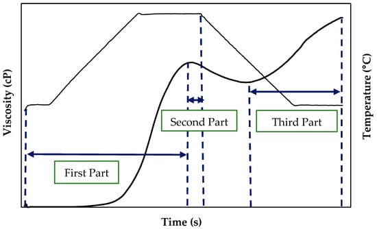 The viscosity curves of the suspensions in water as a function of time obtained from the RVA were fitted to different equations using the StatGraphics software (Centurion XVII, Statpoint Technologies, Warrenton, VA, USA). For modeling, the pasting curves were divided into three sections following Palabiyik et al. (2017) [] (Figure 1).