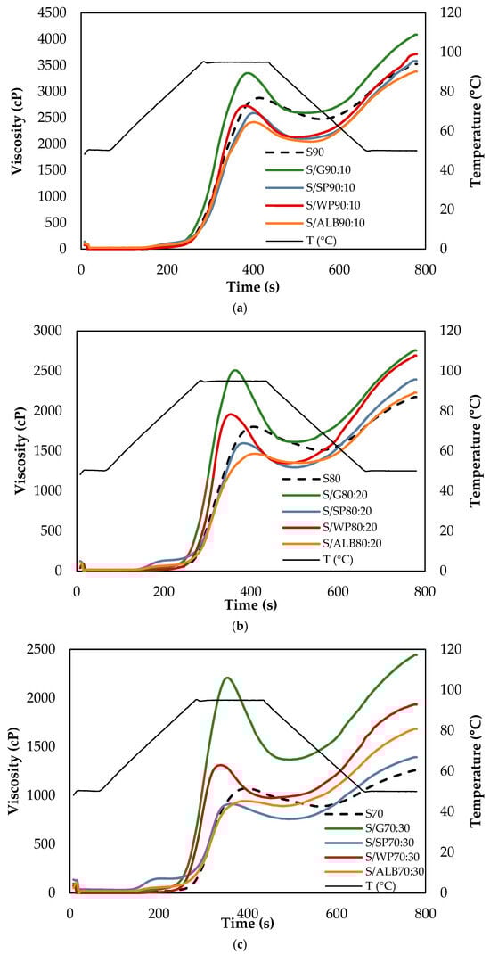Effect of proteins at (a) 10%, (b) 20% and (c) 30% on the apparent viscosity plots for starch pasting. S: starch, G: gluten, SP: soy protein, WP: whey protein, ALB: ovalbumin.