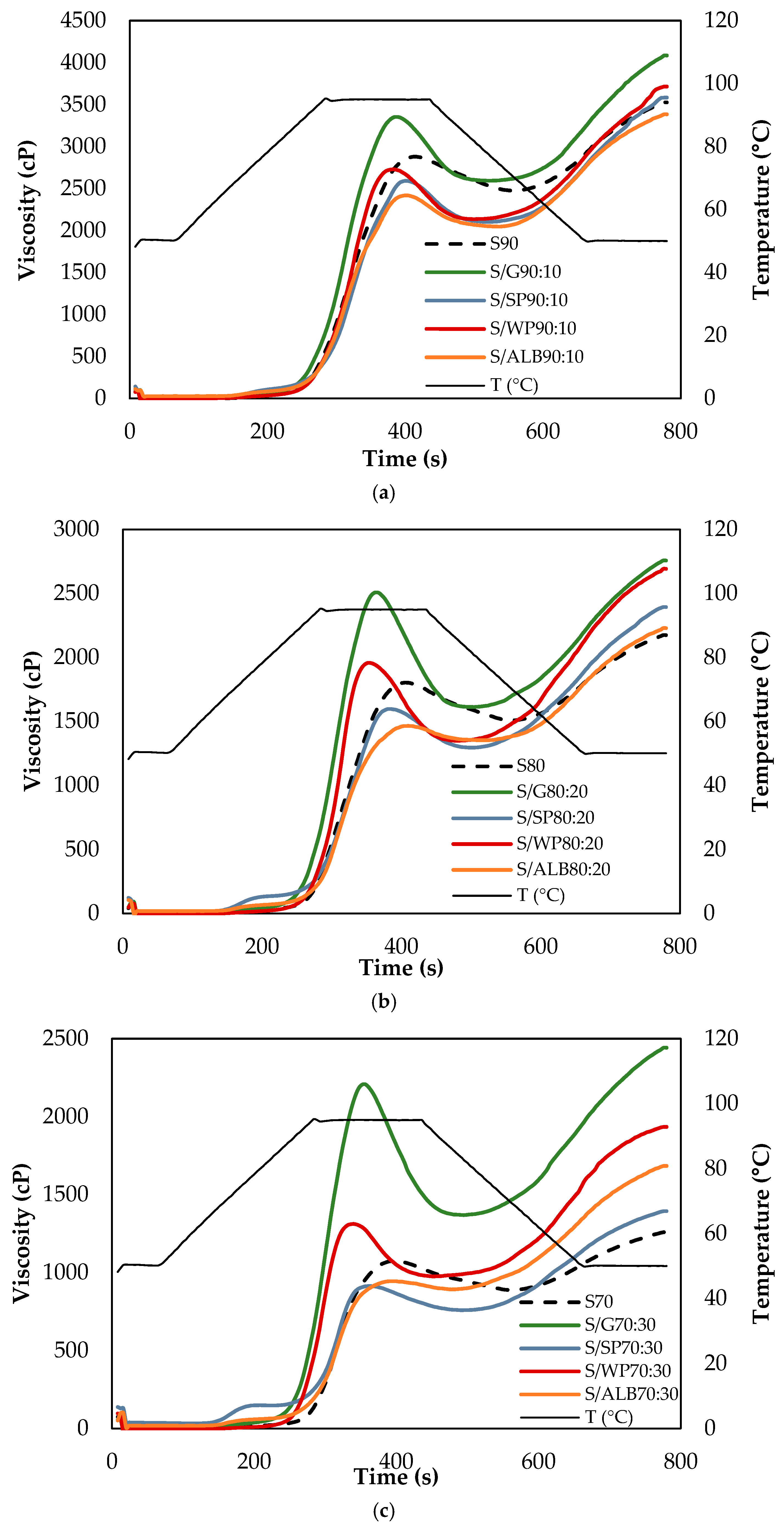 3.1. Effect of Proteins on the Pasting Properties of Starch