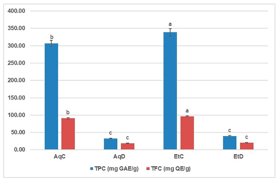 Total phenolic content (TPC) and total flavonoid content (TFC) of digested (D) and control (C) aqueous (Aq) and ethanolic (Et) extracts of C. flexuosus at concentration of 5 mg/mL. Mean values with different superscript letters (a–c) show significantly different TPC or TFC (one-way ANOVA, Tukey’s post hoc; p < 0.05). The superscript letters indicate the values in descending order, with (a) representing the highest value.