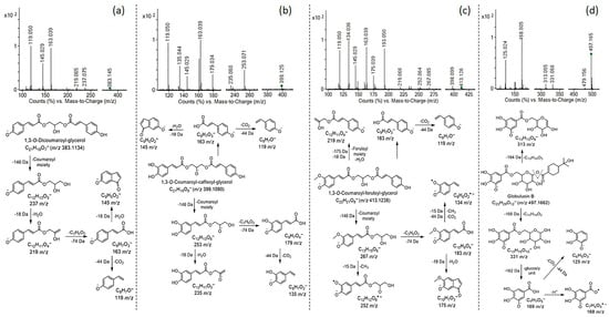 Characteristic MS/MS fragmentation patterns (collision-induced dissociation (CID) mass spectra) and proposed fragmentation pathways of: (a) 1,3-O-Dicoumaroyl-glycerol (m/z 383); (b) 1,3-O-Coumaroyl-caffeoyl-glycerol (m/z 399); (c) 1,3-O-Coumaroyl-feruloyl-glycerol (m/z 413); (d) Globulusin B (m/z 497); (Agilent, Q-ToF, ESI(–), CE = 30 eV). All fragment ions from MS/MS fragmentation patterns are included, explained, and annotated in the proposed fragmentation pathways.