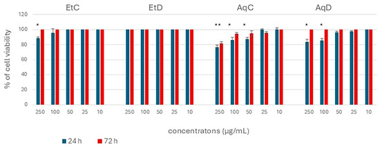 To determine the cytotoxicity of the extracts of C. flexuosus, healthy human keratinocytes (HaCaT cells) were first exposed to the concentration range (10–250 µg/mL) of the extracts for 24 h and then prolonged for 72 h. None of the extracts (control or digested, ethanol or water) led to a reduction in the viability of healthy human keratinocytes, indicating that these extracts are completely safe for healthy cells and human use, without any cytotoxicity even at the highest tested dose. Consistently, other authors have also reported no significant toxicity toward normal fibroblasts at concentrations below 100 µg/mL [54]. These findings are supported by other authors who also propose lemongrass as a functional food and dietary supplement due to the presence of α-glucosidase inhibitors and its low cytotoxic activity [55].