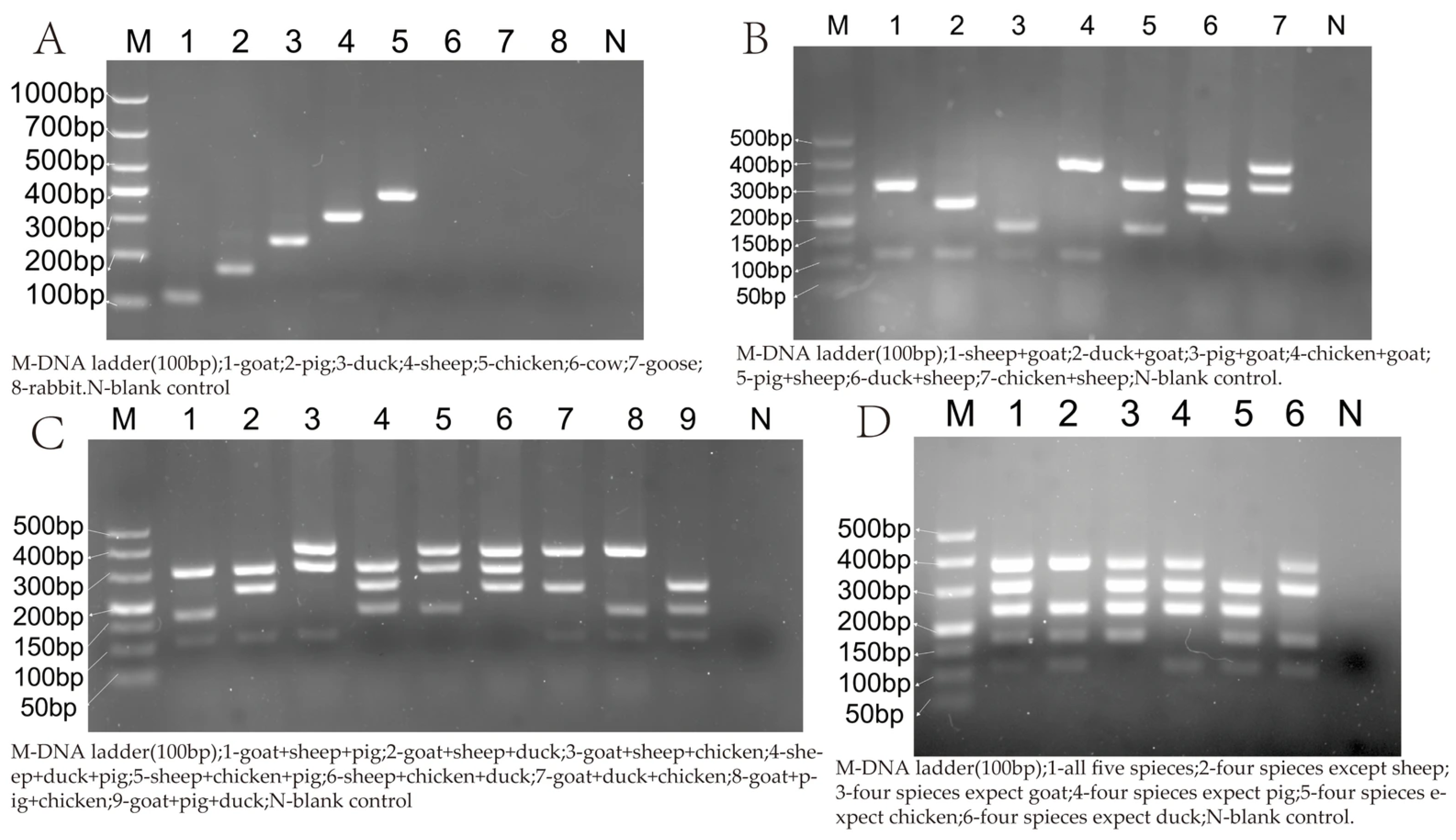 - Li, J.C.; Li, J.P.; Xu, S.G.; Xiong, S.Y.; Yang, J.N.; Chen, X.; Wang, S.W.; Qiao, X.L.; Zhou, T. A rapid and reliable multiplex PCR assay for simultaneous detection of fourteen animal species in two tubes. Food Chem. 2019, 295, 395–402. [Google Scholar] [CrossRef]