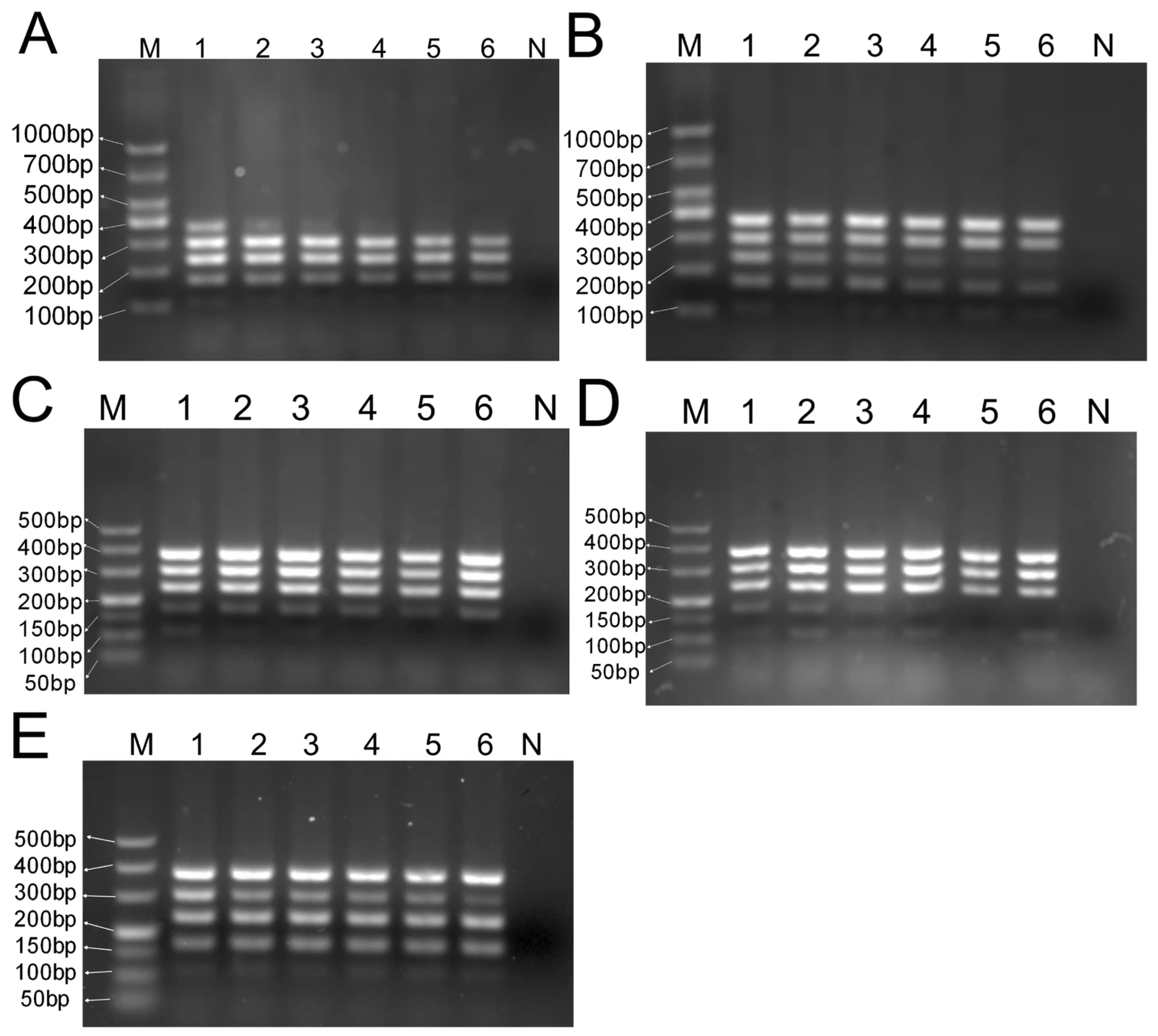 2.3.2. Optimization Testing of Multiplex PCR Amplification Annealing Temperature