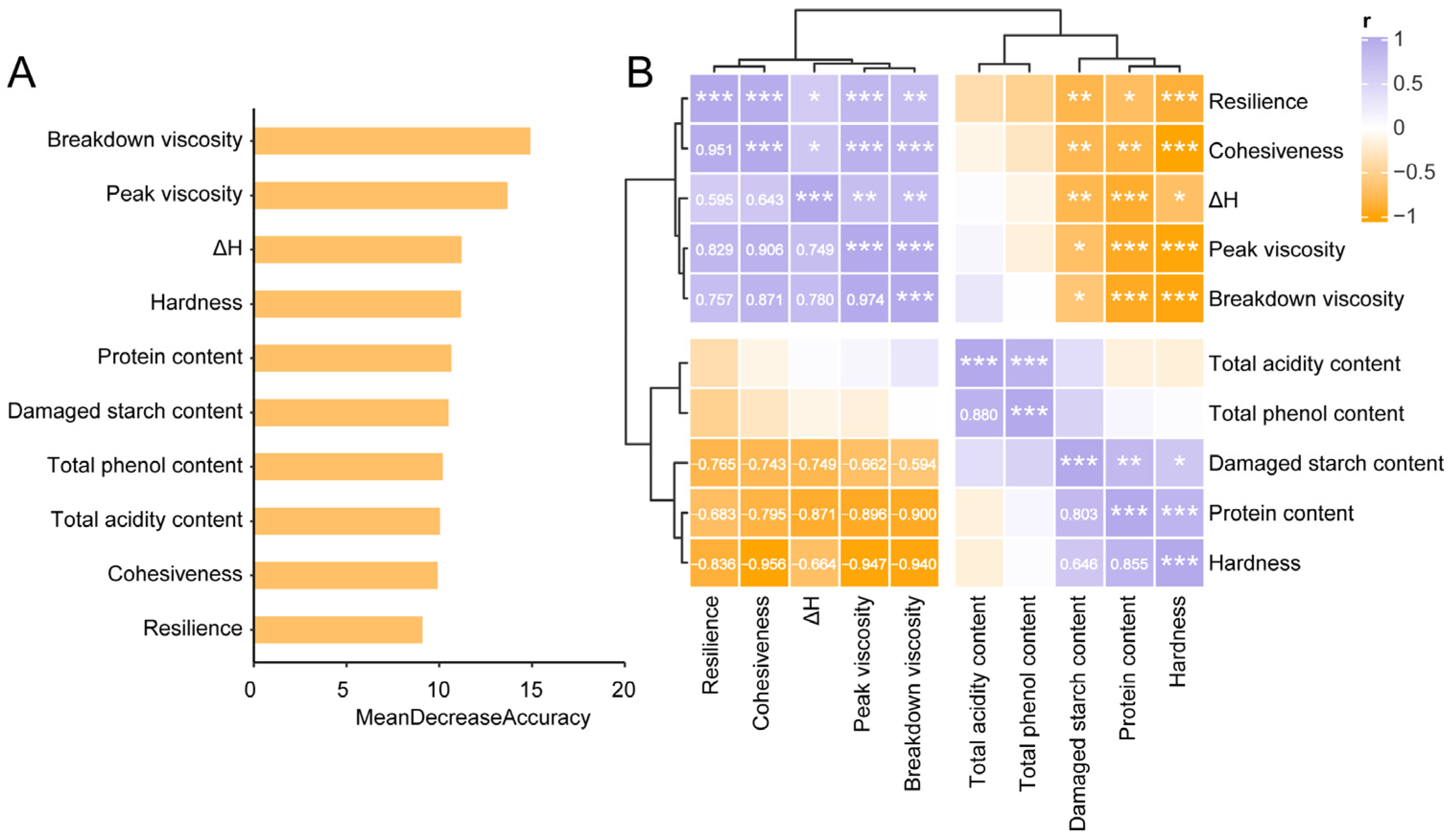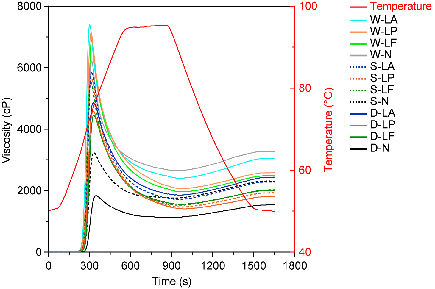 - Liang, C.; Han, Y.; Xu, H.; Liu, D.; Jiang, C.; Li, Q.; Hu, Y.; Xiang, X. The high molecular weight and large particle size and high crystallinity of starch increase gelatinization temperature and retrogradation in glutinous rice. Carbohydr. Polym. 2025, 348, 122756. [Google Scholar] [CrossRef]