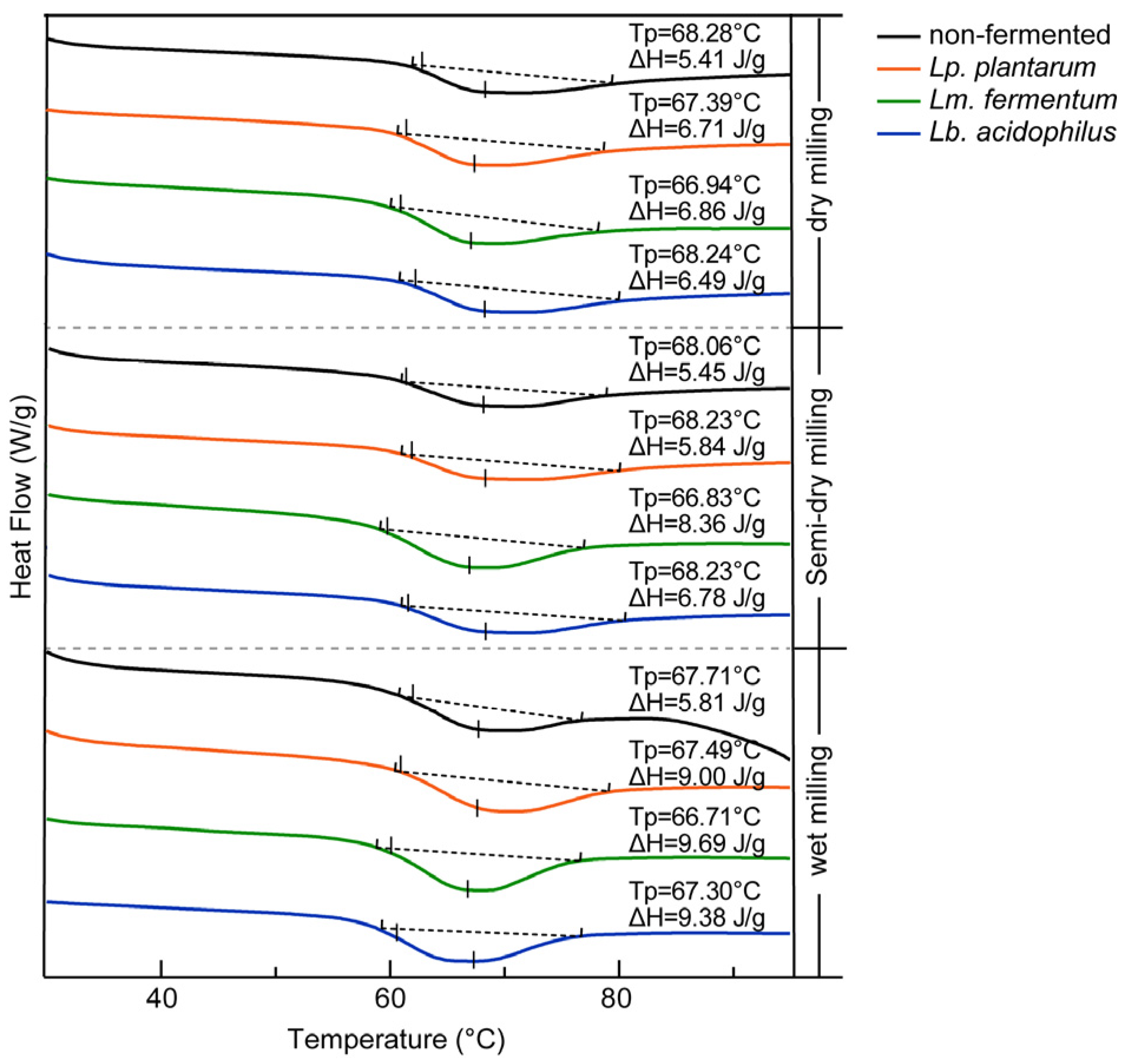 - Zhang, T.; Hong, S.; Zhang, J.-R.; Liu, P.-H.; Li, S.; Wen, Z.; Xiao, J.; Zhang, G.; Habimana, O.; Shah, N.P. The effect of Lactic acid bacteria fermentation on physicochemical properties of starch from fermented proso millet flour. Food Chem. 2024, 437, 137764. [Google Scholar] [CrossRef]