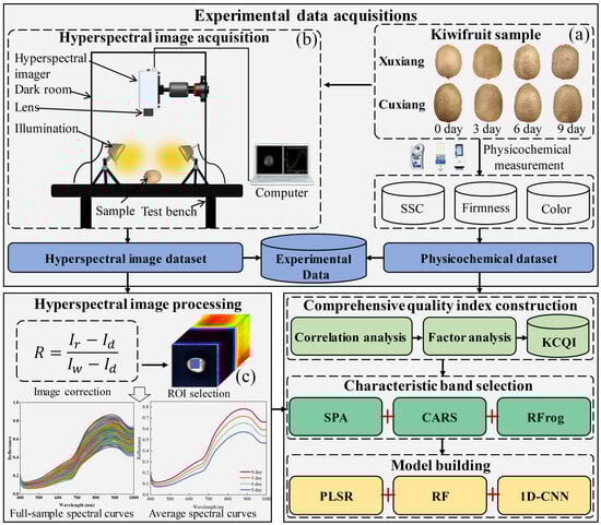 To address this gap, this paper aims to propose a novel kiwifruit comprehensive quality index (KCQI) during shelf life that integrates multiple quality parameters and develops a quantitative estimation method for the KCQI by combining the HSI with 1D-CNN. The specific objectives are as follows: (1) to construct a novel KCQI based on the synergistic integration of multiple quality parameters, (2) to develop a quantitative prediction model for the KCQI using selected spectral characteristic bands in conjunction with 1D-CNN, and (3) to realize the pixel-level mapping and spatial distribution visualization of the KCQI to reveal the law of quality evolution. Figure 1 shows the overall flowchart of this study.