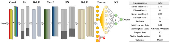 Using the raw reflectance values of kiwifruit as input, quantitative prediction models for the KCQI were developed using PLSR, random forest (RF), and 1D-CNN. PLSR identifies an orthogonal set of latent variables that maximizes the explained variance in the spectral data while optimizing covariance with the KCQI [22]. During modeling, 10-fold cross-validation was used to select the optimal number of latent variables and prevent overfitting. RF, a nonparametric ensemble method, constructs numerous decision trees on random subsets of samples and features, averaging their outputs to improve prediction stability and noise robustness; the number of trees was set to 100 and the minimum leaf-node size to 8 to balance bias and variance [23]. The 1D-CNN model automatically extracts multilevel local spectral features via one-dimensional convolution kernels [24]. As illustrated in Figure 2, the network comprises two convolutional layers (Conv1 and Conv2), each followed by batch normalization (BN) and ReLU activation layers, to accelerate convergence and introduce nonlinearity. A Dropout layer with a 20% drop rate was inserted after the second ReLU to suppress overfitting. A fully connected layer (FC1) then aggregates the multichannel feature maps into a single output, and a regression layer computes the semi-mean-square error to yield continuous KCQI predictions.