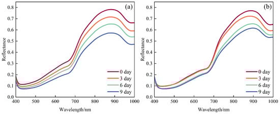 Average reflectance spectra of kiwifruit at different shelf life stages: (a) ‘Xuxiang’ and (b) ‘Cuixiang’.