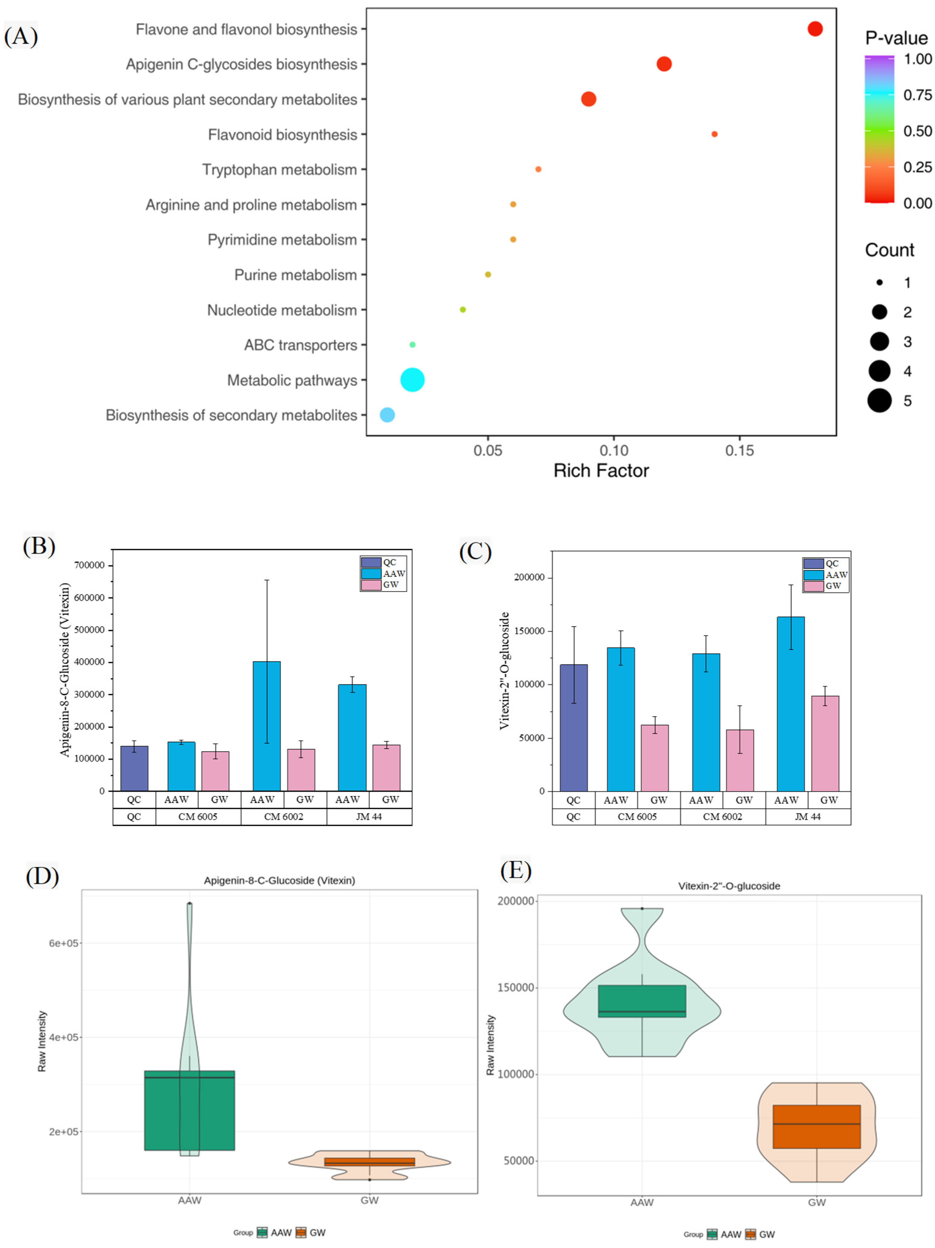 - Li, W.; Ma, Q.; Wang, L.; Liu, L.; Liu, L.; Zhang, Z.; Yan, N. Metabolomic analysis of flavonoid diversity and biosynthetic pathways in whole grains. Food Res. Int. 2025, 211, 116359. [Google Scholar] [CrossRef]
