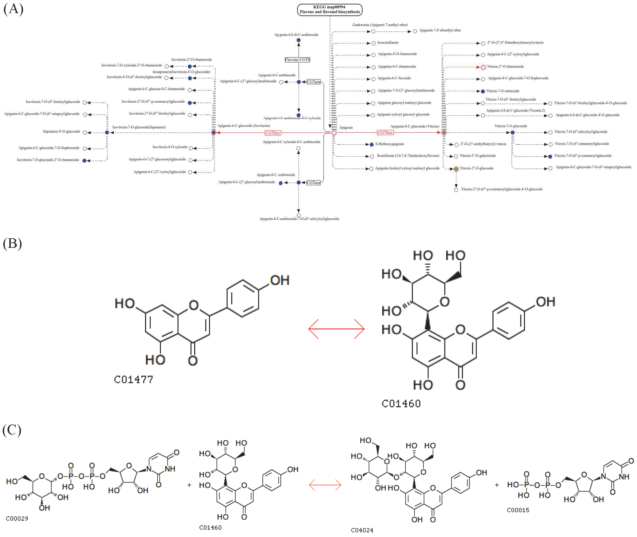 | 21 | Vitexin-2″-O-glucoside | 61360-94-9 | Flavonoids | Flavones | up |