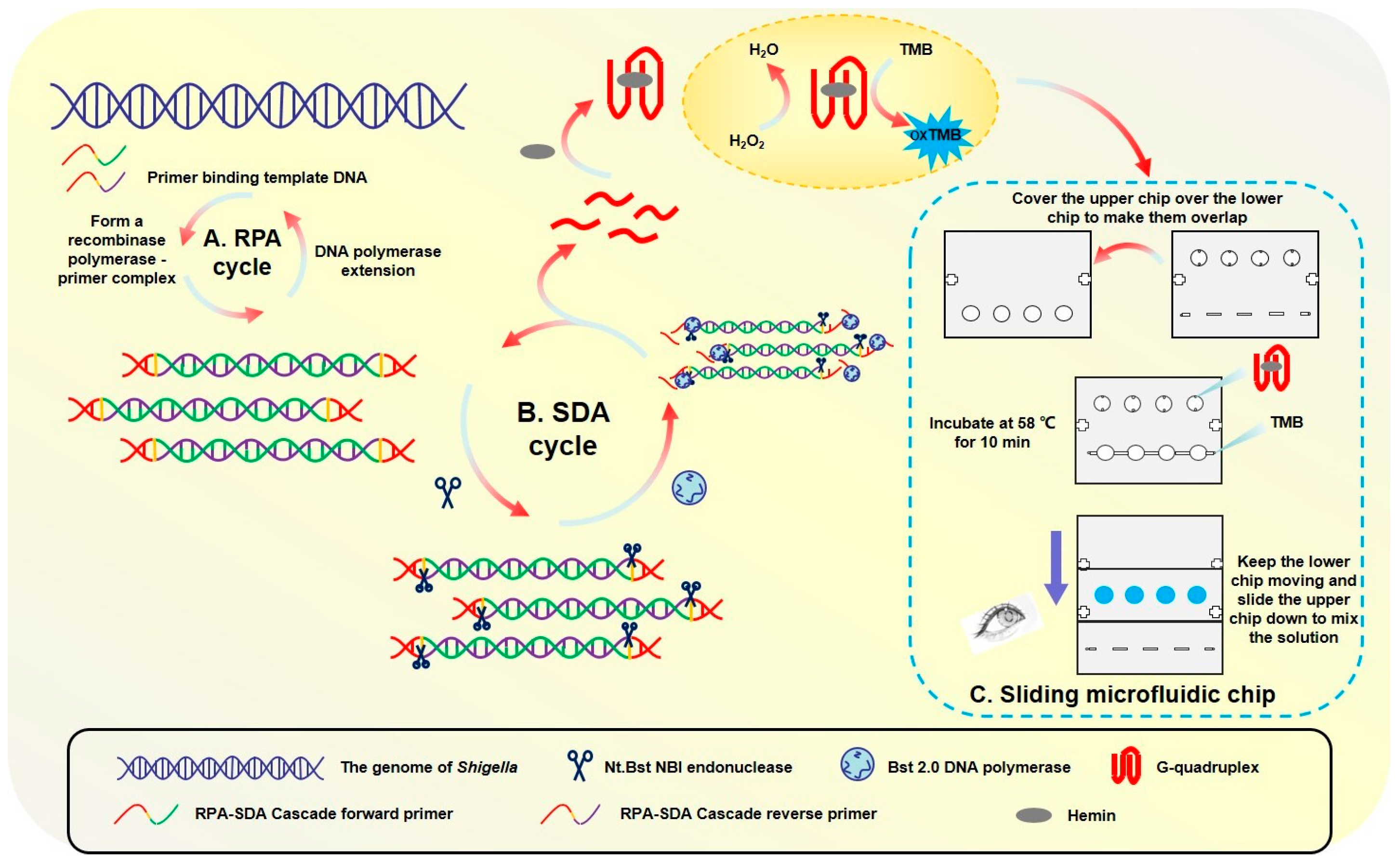 The high specificity of the proposed assay is ensured by a multi-level mechanism. Firstly, the RPA primers exclusively target the Shigella-specific ipaH gene. Secondly, only the correct amplicons contain the necessary functional motifs (G4 sequence and endonuclease site) to initiate the SDA reaction and subsequent signal generation, effectively preventing false-positive signals from non-target DNA.
