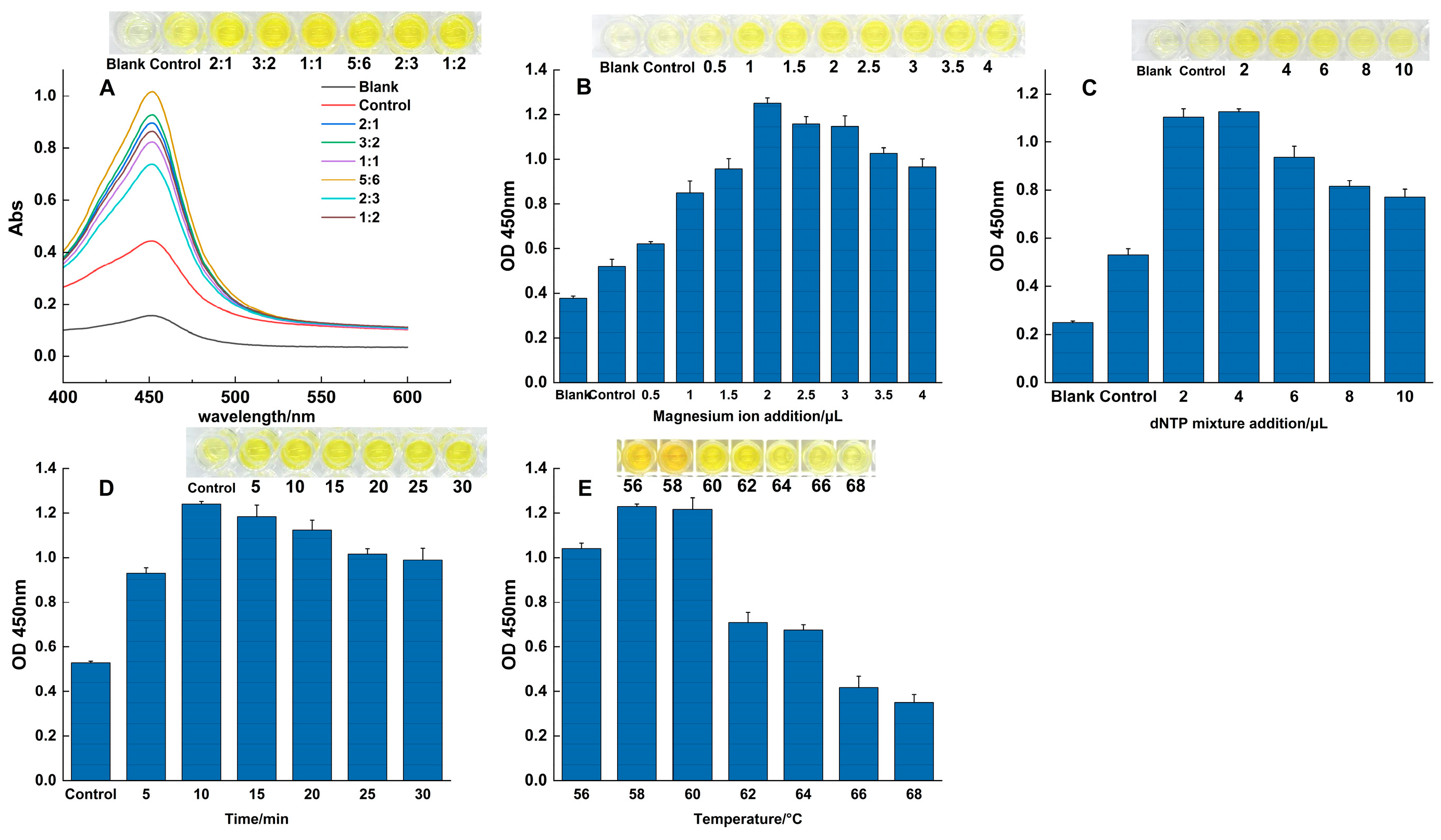 The outcome of each optimization experiment was evaluated using a colorimetric assay. The principle of this assay is that the G4 structures within the SDA amplification products can, in the presence of hemin, catalyze the oxidation of TMB by H2O2, producing a colored solution. To do this, after SDA, the reaction was continued to be incubated at 95 °C for 20 min to inactivate the enzyme and terminate the reaction, and the 25 µL SDA product was mixed with 2 µL of 2 µM Hemin. Subsequently, 36.5 µL of TMB color development solution and 36.5 µL of H2O2 solution were added to the mixture. After a 3 min incubation at room temperature to allow for color development, the reaction was terminated by adding 23.1 µL of 2 M H2SO4. Quantitative analysis was achieved by immediately measuring the absorbance at 450 nm (OD450) with a microplate reader. The condition that resulted in the highest absorbance reading was identified as the optimal setting for that parameter.