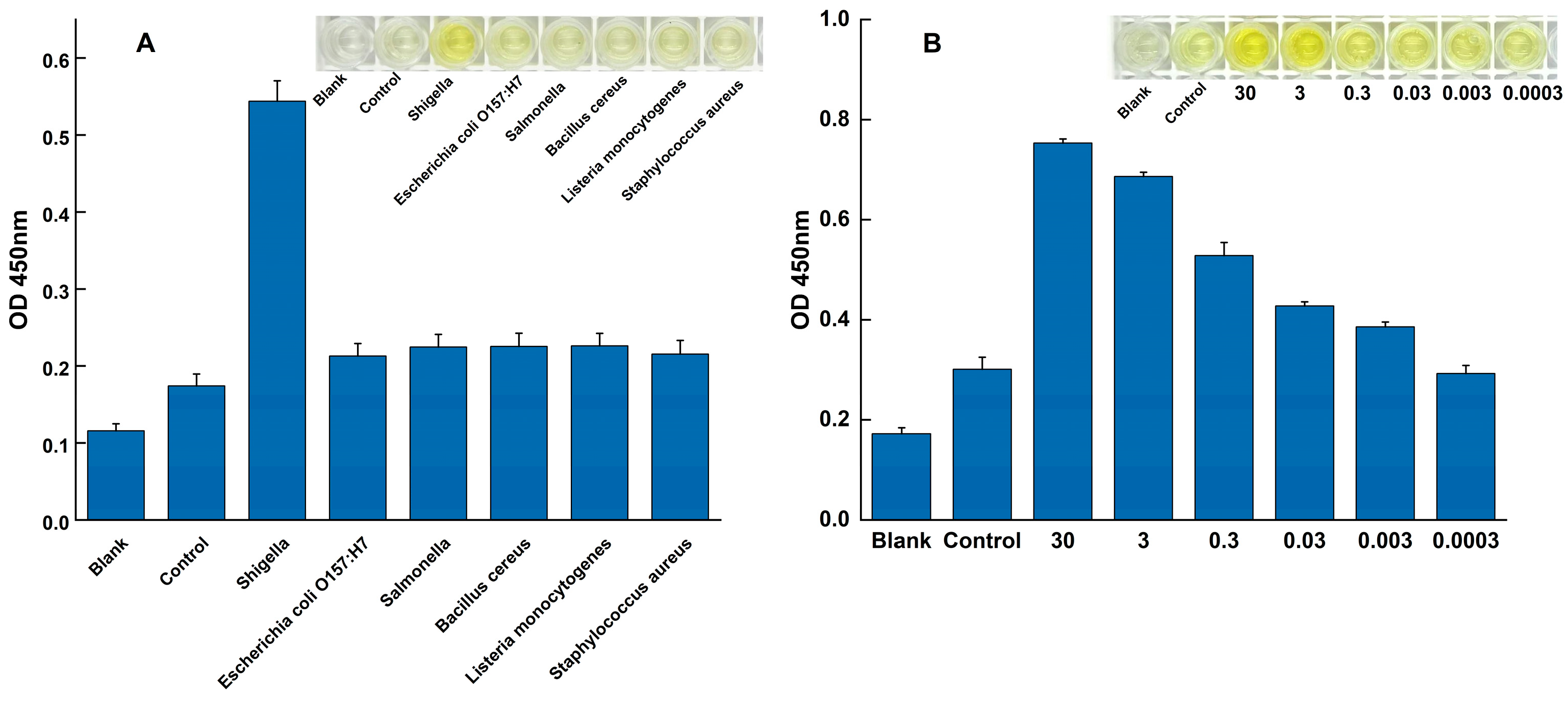 To validate the specificity of the RPA-SDA cascade reaction, a panel of non-target bacteria, including Escherichia coli O157:H7, Salmonella, Bacillus cereus, Listeria monocytogenes, and Staphylococcus aureus, was tested alongside the target organism, Shigella. Genomic DNA was extracted from overnight cultures of each strain to serve as the template for amplification. The reactions were performed under the previously optimized RPA-SDA conditions. Assay performance was evaluated through a dual-assessment method: qualitatively, by recording the visual color change of the TMB reaction, and quantitatively, by measuring the absorbance at 450 nm with a microplate reader. This approach provided a comprehensive evaluation of the cascade system’s ability to specifically recognize Shigella.