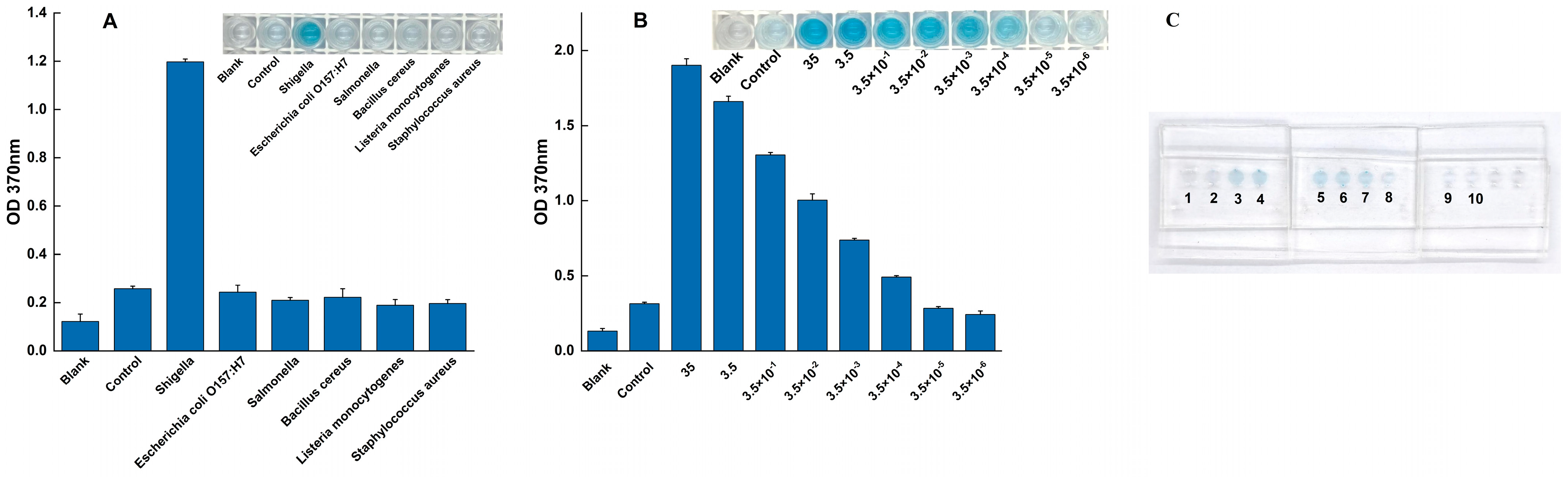 Shigella genomic DNA was used as the template. In contrast, the absorbance signals from all tested non-target pathogens were indistinguishable from the negative control, with their mean values and error bars (mean ± SD) overlapping with the baseline. This result confirms the assay’s high specificity for