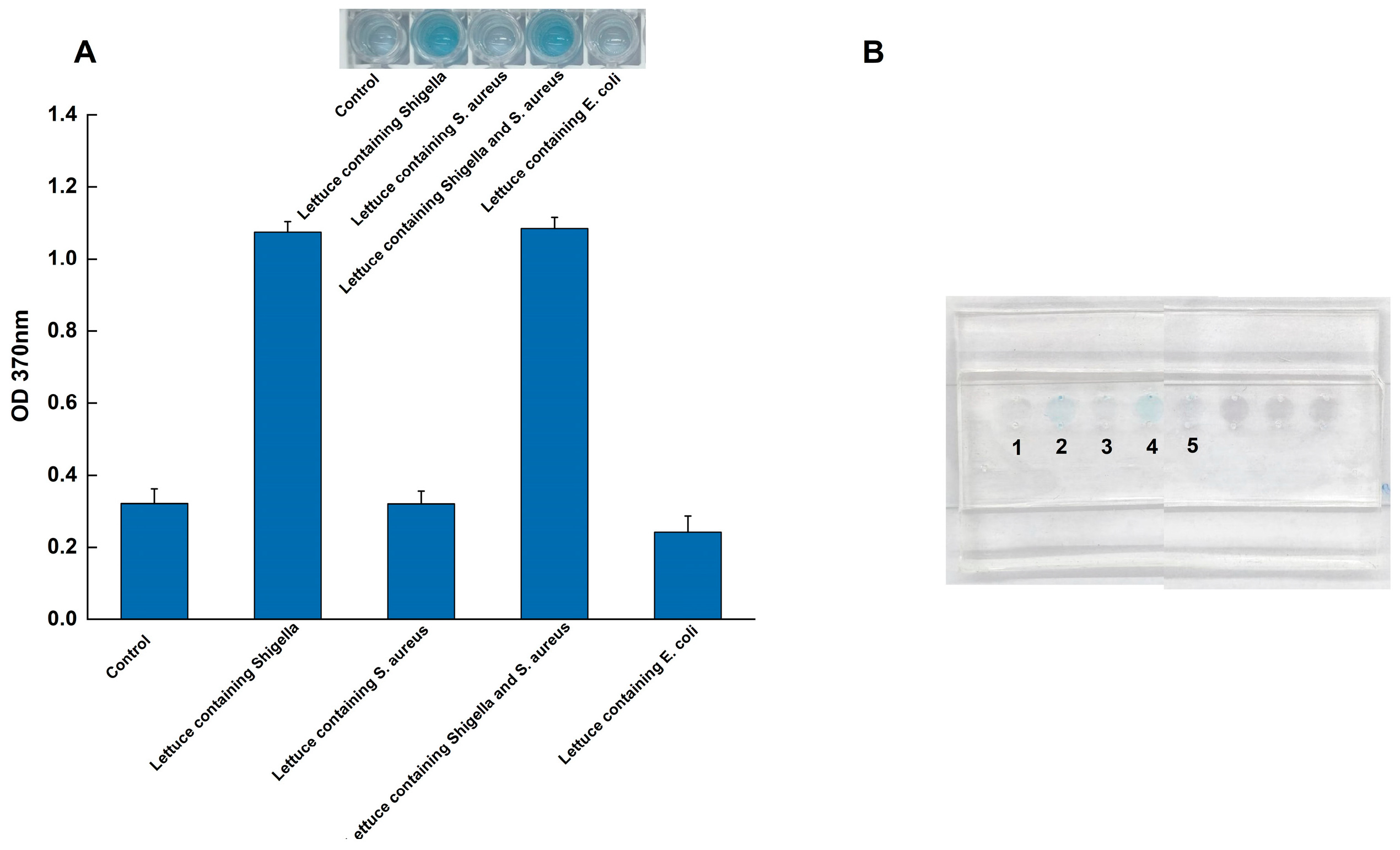 After spiking, all samples were incubated at 37 °C for 12 h to simulate contamination. To recover the bacteria, 5 g of each sample was vigorously mixed with 45 mL of PBS buffer to release the bacterial cells. The suspension was then centrifuged at 5000 rpm for 10 min to pellet the cells. Genomic DNA was subsequently extracted from the pellets using an Ezup column bacterial genomic DNA extraction kit according to the manufacturer’s protocol. This extracted DNA served as the template for the on-chip analysis under the previously optimized conditions. The final colorimetric reaction was developed using the TMB substrate at 37 °C for 15 min. The outcome was assessed both visually and by measuring the absorbance at 370 nm with a microplate reader.