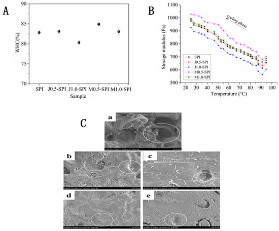 The effect of enzyme modification on the WHC of soybean protein isolate gel (A). SPI denotes untreated gel, J0.5-SPI, J1.0-SPI, M0.5-SPI and M1.0-SPI denote gels hydrolyzed SPI by alkaline protease and papain with hydrolysis at 0.5% and 1.0%, respectively. Storage modulus (G’) of TG cross-linked Chiba tofu gel after partial hydrolysis of papain and alcalase during the cooling phase (B). The effect of enzyme modification on the microstructure of soybean protein isolate gel (C). (a) denotes untreated gel, (b,c) denote SPI modified with alkaline protease at DH = 0.5% and DH = 1%, (d,e) denote DH = 0.5% and DH = 1% papain modified SPI.
