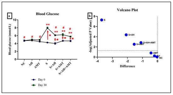 (a) Blood glucose level in rats were measured on day 0 and day 30 in all groups. Comparison was performed using Paired-t-test. (b) The results were visualized in a volcano plot. The higher plot values observed in the S group compared to other groups indicate the most significant changes occured in the S group. * indicates statistical significance (p < 0.05) comparison between day 0 and day 30 within the same group (red arrow, Paired-t-test). ** indicates statistical significance (p < 0.05) comparison with NC group on Day 30 (one-way ANOVA), # indicates statistical significance (p < 0.05) compared with S group comparison using one-way ANOVA, n = 6 independent observations.