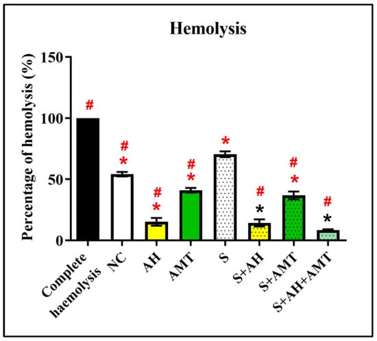 An in vitro blood hemolysis assay was conducted at the end of the in vivo study to evaluate the protective effect of AH against oxidative stress-induced hemolysis (Figure 3). All treatment groups [NC (81.00% ± 4.64), AH (15.15% ± 3.21), AMT (40.95% ± 1.91), S (70.48% ± 2.41), S + AH (14.30% ± 2.96), S + AMT (36.80% ± 3.18), and S + AH + AMT (8.45% ± 0.62)] showed a significant reduction in hemolysis compared to the complete hemolysis control group (100% ± 0.00, p = 0.00). Particularly, the S + AH, S + AMT, and S + AH + AMT groups exhibited significantly lower hemolysis compared to the S group (p = 0.00), indicating that AH, alone or in combination with AMT, effectively mitigates H2O2-induced erythrocyte damage under stress conditions. This is due to high phenolic and flavonoid content in AH, as demonstrated in our previous study [].