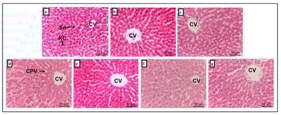 Histological sections of liver tissue. Representative liver sections from each experimental group (n = 6): (a) normal control, (b) Acacia honey, (c) amitriptyline, (d) stress-induced, (e) stress treated with Acacia honey, (f) stress treated with amitriptyline, and (g) stress treated with a combination of Acacia honey and amitriptyline. CV, central vein; Sn, sinusoidal; KC, Kupffer cell; CPV, cytoplasmic vacuolation. Scale bar: 50 µm.