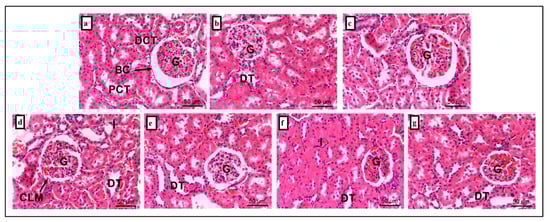 Histological section of kidney tissue. It was consists of groups (a) NC, (b) acacia honey, (c) amitriptyline, (d) stress-induced, (e) stress treated with Acacia honey, (f) stress treated with amitriptyline, and (g) stress treated with a combination of Acacia honey and amitriptyline. G, glomerulus; BC, bowman’s capsule; PCT, proximal convoluted tubules; DCT, distal convoluted tubules; CLM, cell lining missing; DT, dilated intertubular capillaries; I, inflammation. Scale bar: 50 µm. n = 6 independent observations.