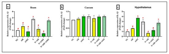 In contrast, no significant changes were observed in the caecum sample (Figure 6b) for group of AH (1.06-fold ± 0.09, p = 1.00), AMT (1.21-fold ± 0.08, p = 0.54), S (1.21-fold ± 0.10, p = 0.54), S + AH (1.09-fold ± 0.18, p = 0.97) S + AMT (1.19-fold ± 0.09, p = 0.60) and S + AH + AMT (1.21-fold ± 0.07, p = 0.51) compared to NC group (1.00-fold ± 0.00). IL-1β was not modulated in the caecum during stress-induced depression in rats, possibly due to regional immune tolerance and lower microbial stimulation compared to the ileum. The ileum includes higher microbial density and immune cell activity, as previously reported in TH17 cell expansion that enhance IL-1β signalling via microbiota-derived cues and NF-κB activation [].