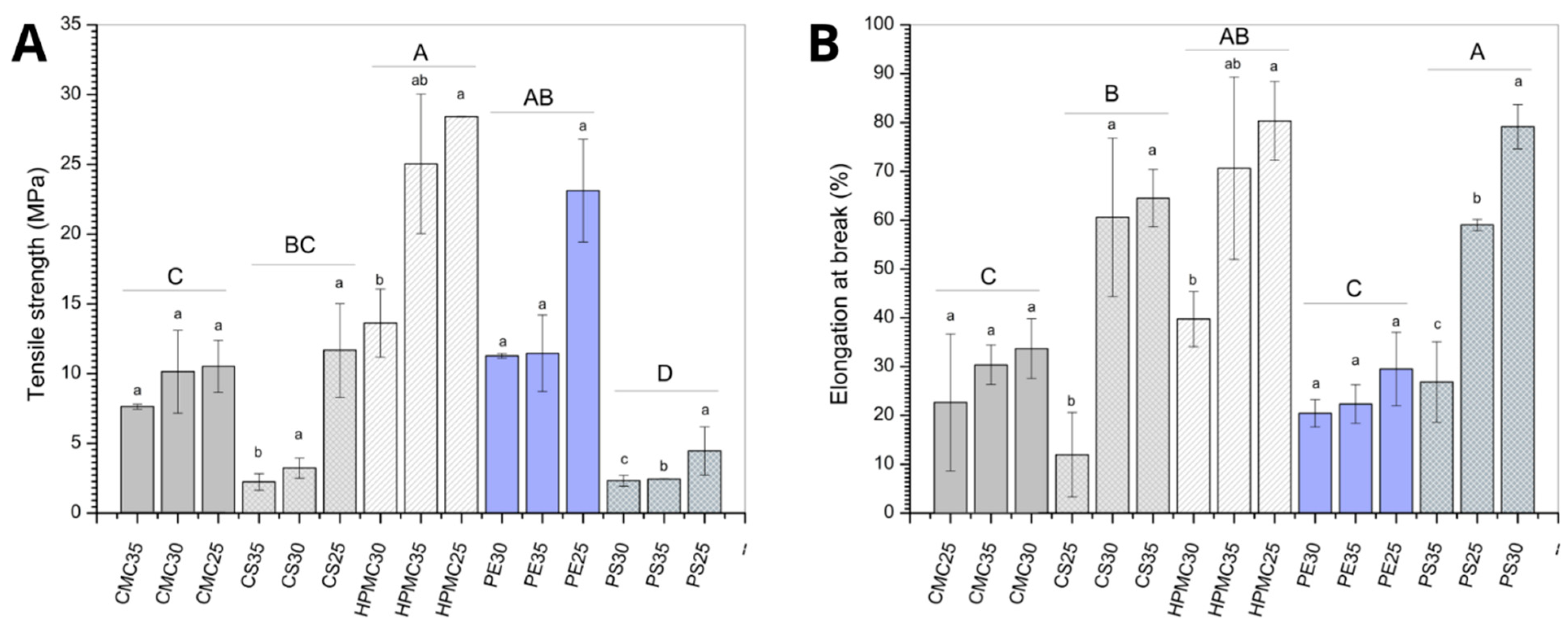3.4. Mechanical Properties: Stress Resistance and Stretch Percentage