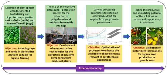 The research focuses on improving a hybrid percolation–ultrasound extraction method to increase the efficiency of bioactive compound recovery from sage and nettle. The aim was to maximize the extraction yield of metabolites having bioprotective and fertilizing functions, thereby enhancing their applicability in sustainable agriculture. Although ultrasound and percolation-based extraction techniques have been widely studied under controlled laboratory conditions, a critical gap persists regarding their validation in real cultivation environments. To address this gap, the present work offers a preliminary experimental validation of the obtained extracts in commercial greenhouse systems, using pepper and tomato crops as test models.