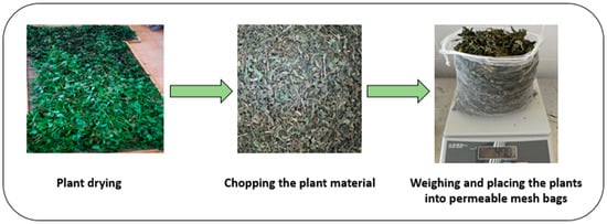 For the experimental treatments, 400 g of dried and cut material from each plant species was weighed and placed into special permeable bags, designed to allow uniform contact with the solvent during the extraction process (Figure 3).
