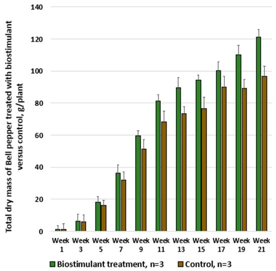 Weekly comparative analysis of total dry mass for tomato plants treated with biostimulant versus untreated control.