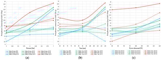 Graphic representation of polyphenol content for nettle: (a) as a function of pressure, at minimum and maximum levels of extraction time and ultrasound power; (b) as a function of extraction time, for minimum and maximum values of ultrasound pressure and power; (c) as a function of ultrasound power, for minimum and maximum values of pressure and extraction time.