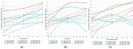 Graphic representation of polyphenol content for sage: (a) as a function of pressure, at minimum and maximum levels of extraction time and ultrasound power; (b) as a function of extraction time, for minimum and maximum values of ultrasound pressure and power; (c) as a function of ultrasound power, for minimum and maximum values of pressure and extraction time.