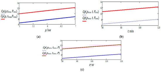 Figure 22 presents graphical representations of partial functions of two and one variable for the total polyphenol content extracted from the sage plant. The figures in this subchapter illustrate one-dimensional representations. It is observed that the extreme values of polyphenol content occur at the boundaries of the working domain, corresponding to the combinations (pmin, tmin, Pmin) and (pmax, tmax, Pmax). This distribution aligns with the expected behavior: beyond a certain extraction duration, the polyphenol reserves in the plant material are progressively depleted, and the incremental effects of pressure and ultrasound diminish. In this region, nonlinear effects may emerge due to the functional limits of the process, both temporally and within the three-dimensional variable space . A more detailed exploration of these effects would require expanding the experimental domain and applying a finer discretization of the variables to characterize the saturation region more precisely.