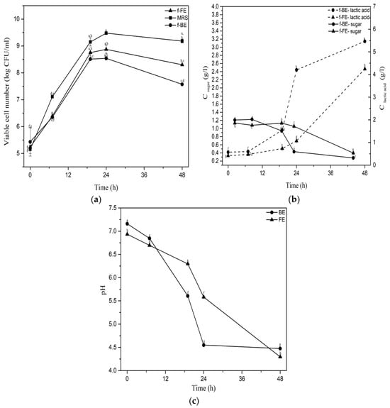 Fermentation parameters: (a) viable cell number of L. salivarius, (b) sugar (solid line) and lactic acid (dashed line) concentrations, and (c) pH. Symbols: f-FE (fermented common nettle flower extract) (▲), f-BE (fermented common nettle by-product extract) (●), and MRS (■). Different letters indicate significant differences (p < 0.05) among all samples, as determined by two-way ANOVA followed by Tukey’s post hoc test.