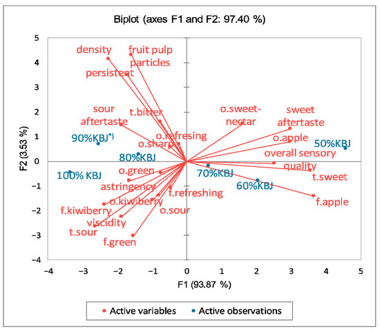 Principal component analysis plot of the similarities and differences in the sensory characteristics of the kiwiberry juice (KBJ) and blends of kiwiberry/’Jonagold’ apple juice (JAJ); *) Samples: 90%KBJ/10%JAJ, 80%KBJ/20%JAJ, 70%KBJ/30%JAJ, 60%KBJ/40%JAJ, 50%KBJ/50%JAJ; o.—odour, t.—taste, f.—flavour.
