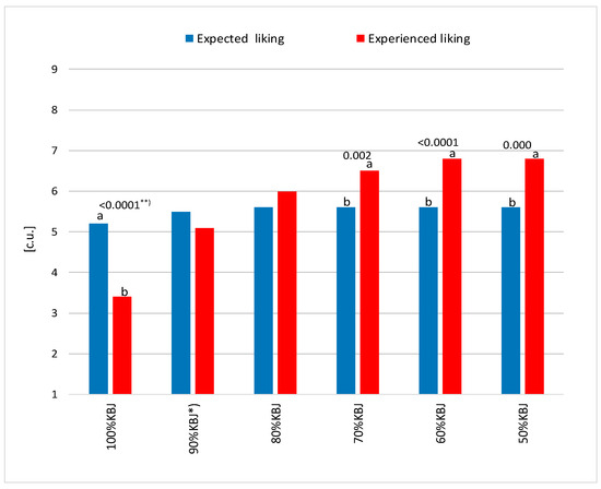 Relationship between the expected and experienced liking for kiwiberry juice (KBJ) and blends of kiwiberry with ‘Jonagold’ apple juice (JAJ). The average values marked with different letters in the graph differ significantly for a given juice variant at p ≤ 0.05; **) p-Value; *) Samples: 90%KBJ/10%JAJ, 80%KBJ/20%JAJ, 70%KBJ/30%JAJ, 60%KBJ/40%JAJ, 50%KBJ/50%JAJ.