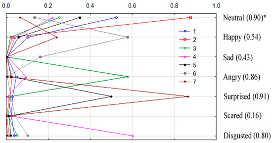 The results of emotional reactions measured with FaceReader related to the evaluated juices are shown in Table 4. The type and level of emotion showed that the ranges of variation in each type of emotion varied. Among all facial expressions, neutrality was the most prominent in the examined juices. However, we can observe that anger and happiness represented higher intensity than the other emotions, in particular scared and sad, which were at the margins of the overall emotional reactions in the samples.