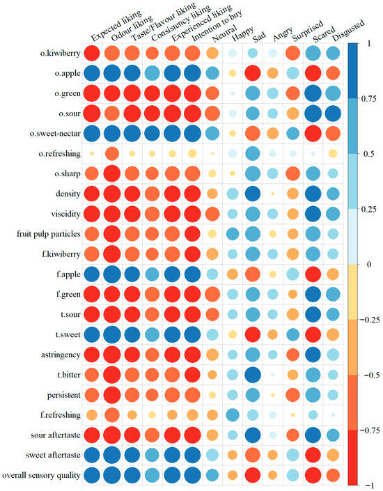 Graphical representation of the Pearson correlation matrix for the sensory characteristics of juices, their consumer liking assessment, and emotional consumer response. Blue and red colours indicate positive and negative correlations, respectively. The lighter the tone used, the less strong is the corresponding correlation; o.—odour, t.—taste, f.—flavour.