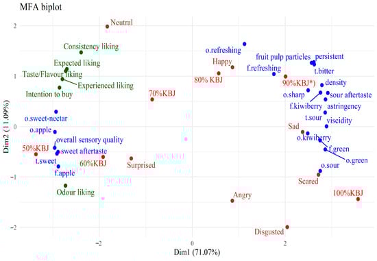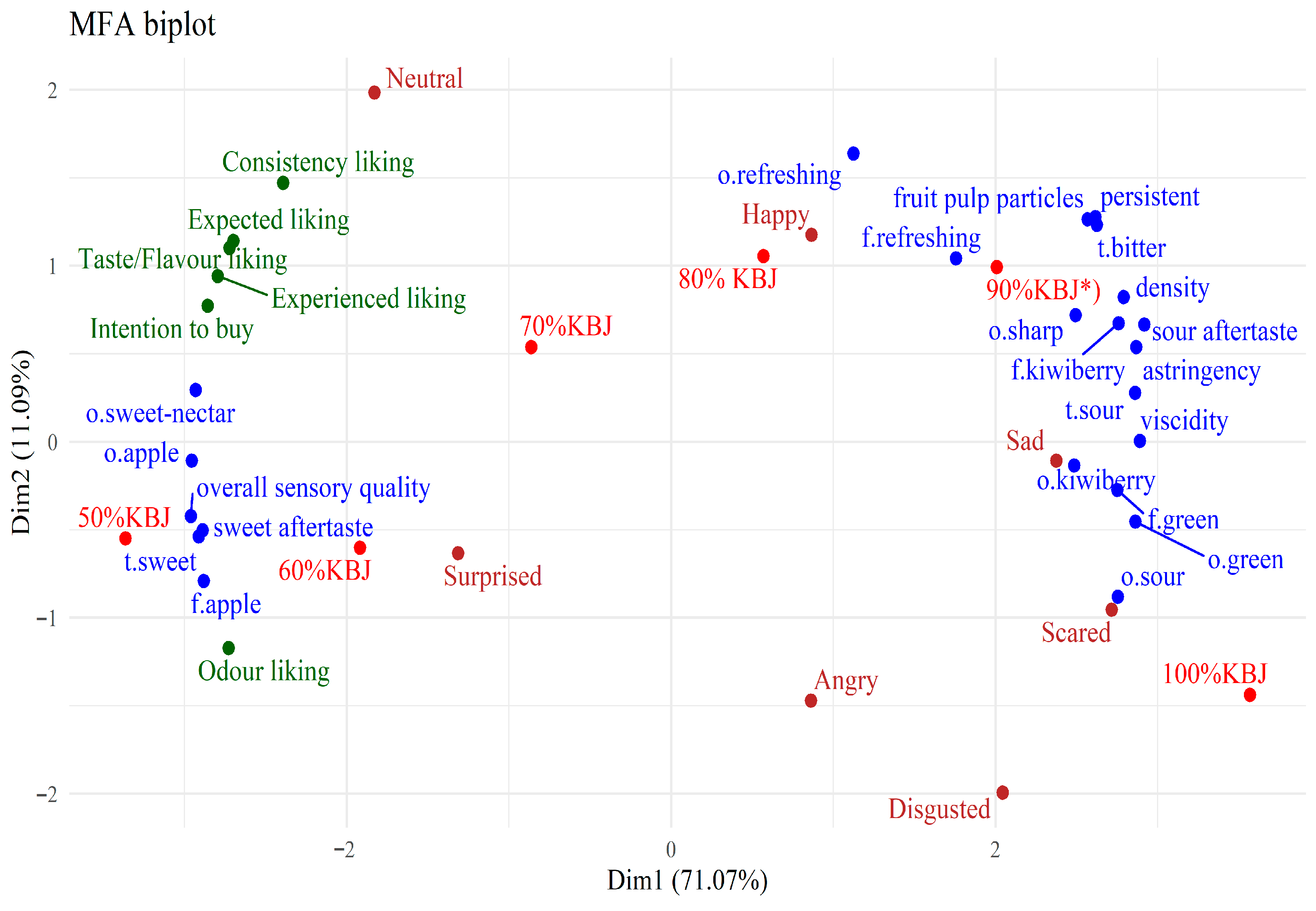 The results of the MFA on the sensory profiles of the examined juices in relation to the average consumer preferences and emotional reactions are presented in Figure 6. Like in the case of the PCA plot in Figure 1, most of the variability, 71.07%, was related to the first plot dimension, and the second dimension accounted for 11.09% of the variability. The second dimension only weakly separates the attributes positioned on the left side of the first dimension, and thus it is driven mostly by the differences in the attributes on the right side of the plot. According to the plot, all liking scores increase with an increase in the sensory overall quality, sweet-related odours and tastes, as well as the apple odour and flavour. Consequently, these scores are negatively associated with attributes located on the opposite end of the first dimension, bitter, sour, green, sharp, refreshing odours and flavours, astringency, viscidity, density and persistent sensations, and others. It was found that samples with 30% apple juice content were located close to liking attributes. In terms of the second dimension, most of the liking scores are closer to the refreshing odour and flavour, fruit pulp particles, persistent and density sensations, and bitter taste, opposed to the kiwiberry odour, and sour and green odour and flavour. An exception is the consumers’ odour liking, which is positioned on the opposite side of the second dimension compared to the other liking scores.