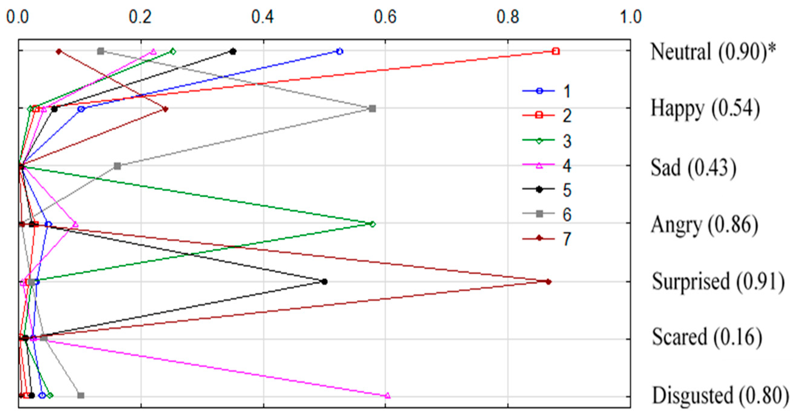 Cluster 2, comprising 20% of the recorded emotional states, contained the highest level of neutrality among all clusters. In contrast, cluster 3 (13% of recorded reactions) was characterised by a relatively high intensity of negative emotions like angry and showed affinity for 60%KBJ and 100%KBJ. It was found that cluster 4 represented a high intensity of disgusted emotion. Cluster 5 was mainly determined by the level of surprise. It is noteworthy that cluster 6 was mainly determined by a high intensity of positive emotion (happiness) and followed by the state of sadness, showing a higher affinity for 70%KBJ/30%JAJ and 100%KBJ. A characteristic feature of cluster 7 was the high proportion of surprised and, to a lesser extent, happiness, and it showed a higher affinity to 70% kiwiberry sample. It seems that a high level of happiness and a relatively low intensity of negative emotions, i.e., sad, angry, or disgust, accompanied the sample with 30% apple juice addition, which caused a relatively higher amount of happy emotion represented by the profile of clusters 6 and 7 (Table 5, Figure 4).