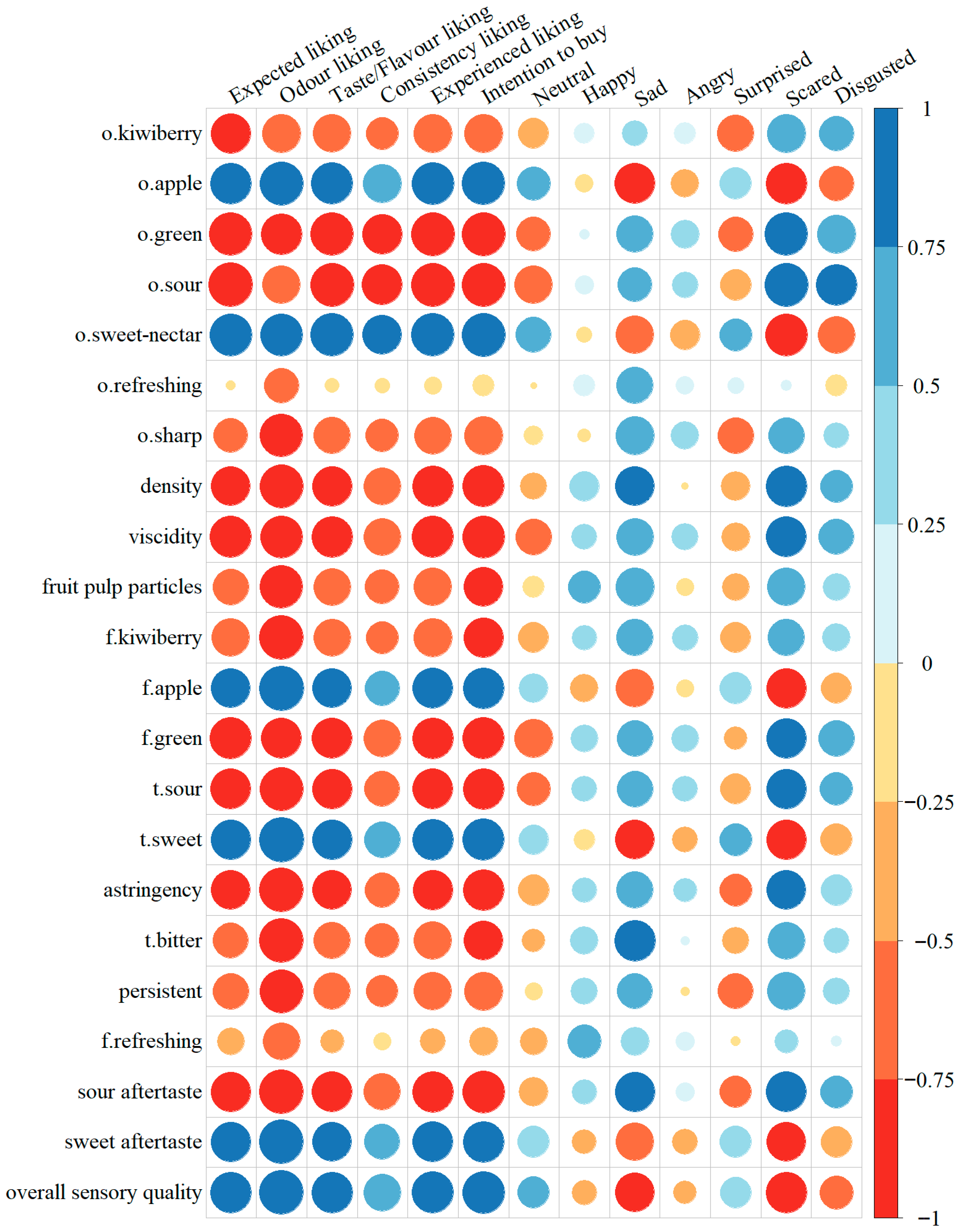 In terms of emotional responses, the emotion scared was strongly positively correlated with green odour and flavour; sour odour, taste, and aftertaste; as well as viscosity and density. It was negatively correlated with apple odour and flavour, sweet-nectar odour, sweet taste and aftertaste, and overall sensory quality. It was found that the emotion sad was negatively associated with apple odour, sweet taste, and overall sensory quality, while positively correlated with density, bitter taste, and sour aftertaste. The emotion disgusted showed a strong positive correlation with sour odour. No strong correlations were observed between other emotions (happy, neutral, angry, surprised) and the sensory attributes of the juices.