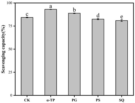 DPPH scavenging capacity of rapeseed oil and rapeseed oil supplemented with different antioxidative substances. Abbreviations: α-TP, α-tocopherol; PG, propyl gallate; PS, phytosterols; SQ, squalene. a–e mean significance analysis of scavenging capacity of rapeseed oil supplemented with different antioxidative substances after ESD at 180 °C for 60 min, and different letters indicate significant differences (p < 0.05).
