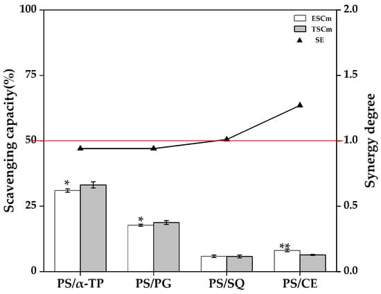 DPPH scavenging capacity and synergistic effects of binary mixtures of antioxidative substances in the PS model group. Abbreviations: α-TP, α-tocopherol; PG, propyl gallate; PS, phytosterols; SQ, squalene; ESCm, the experimental DPPH scavenging capacity of the binary mixtures of antioxidative substances; TSCm, the theoretical DPPH scavenging capacity of the binary mixtures of antioxidative substances; SE, the synergistic effects of binary mixtures of antioxidative substances. The abscissa represents the constituent components of the binary mixtures of antioxidative substances. Different asterisks indicate statistically significant differences between ESCm and TSCm (* p < 0.05, ** p < 0.01).