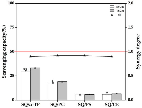 DPPH scavenging capacity and synergistic effects of binary mixtures of antioxidative substances in the SQ model group. Abbreviations: α-TP, α-tocopherol; PG, propyl gallate; PS, phytosterols; SQ, squalene; ESCm, the experimental DPPH scavenging capacity of the binary mixtures of antioxidative substances; TSCm, the theoretical DPPH scavenging capacity of the binary mixtures of antioxidative substances; SE, the synergistic effects of binary mixtures of antioxidative substances. The abscissa represents the constituent components of the binary mixtures of antioxidative substances. Different asterisks indicate statistically significant differences between ESCm and TSCm (* p < 0.05, ** p < 0.01).