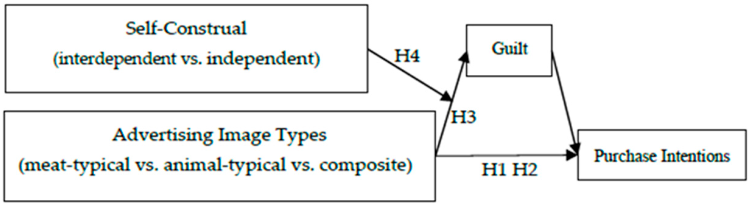 Guilt is a secondary emotion that arises from self-evaluation. Individuals experience guilt when they perceive that their actions have violated moral or behavioral standards they personally value [35]. Research has demonstrated that meat consumption often elicits guilt, as individuals experience moral conflict between satisfying dietary preferences and avoiding harm to animals [11]. Studies on animal-related visual cues indicate that advertisements or labels featuring animal imagery can heighten consumers’ awareness that meat originates from living animals, thereby eliciting moral emotions such as guilt and reducing their willingness to consume meat [36,37]. Therefore, we can predict that when the advertisement shows typical images of animals, consumers will be prompted to evaluate the behavior of “killing animals for eating meat”, which will activate consumers’ moral emotions, thus generating guilt and ultimately affecting consumers’ willingness to buy.